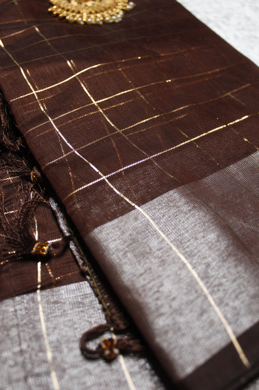 Sold outBrown Linen Saree with Gold Checked